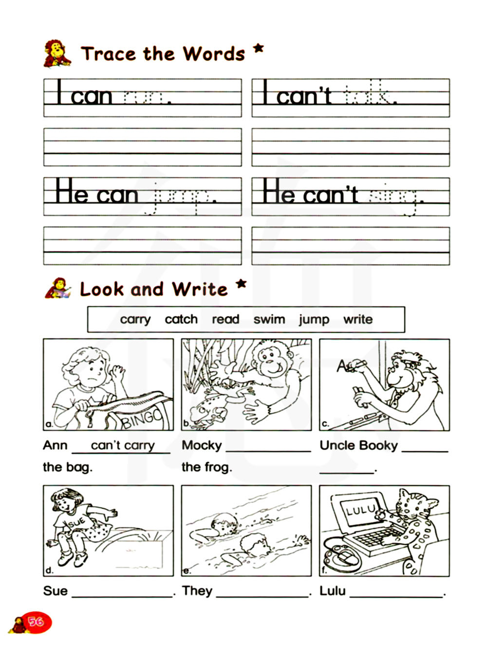 搬 抓住 读 游泳 跳 写