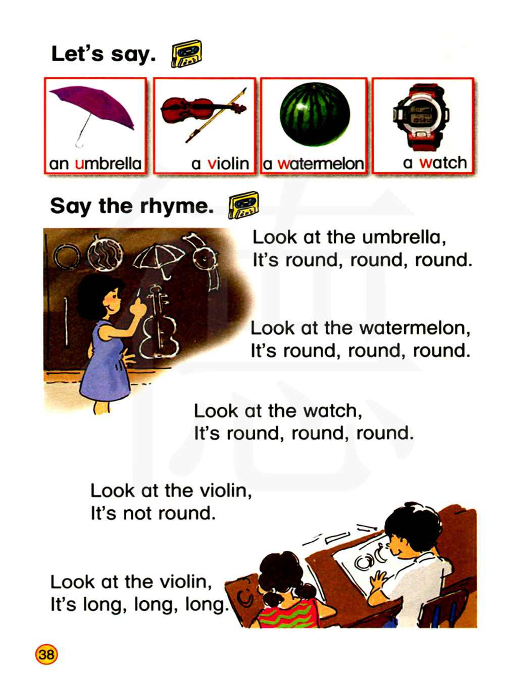看这把雨伞,它是圆的,圆的,圆的。看这个西瓜,它是圆的,圆的,圆的。看这块手表,它是圆的,圆的,圆的。看这把小提琴,它不是圆的。看这把小提琴,它是长的,长的,长的。