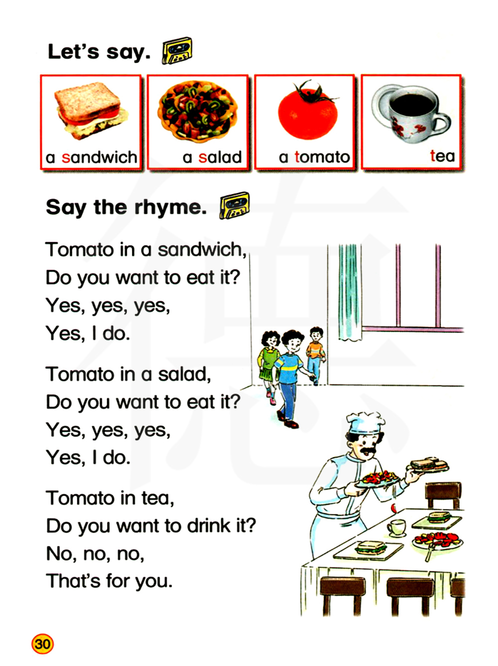 西红柿在三明治里,你想吃吗?是,是,是,是的,我想吃。西红柿在色拉里,你想吃吗?是,是,是,是的,我想吃。西红柿在茶里,你想喝吗?不,不,不,那是给你的。