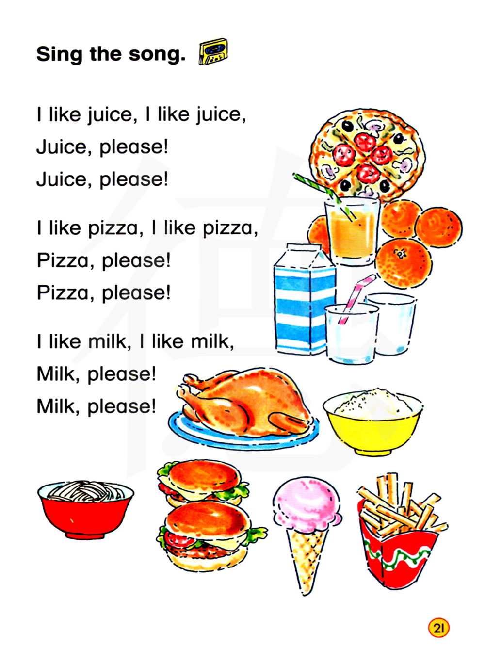 我喜欢喝果汁,我喜欢喝果汁,果汁,请!果汁,请!我喜欢吃披萨,我喜欢吃披萨,披萨,请!披萨,请!我喜欢喝牛奶,我喜欢喝牛奶,牛奶,请!牛奶,请!