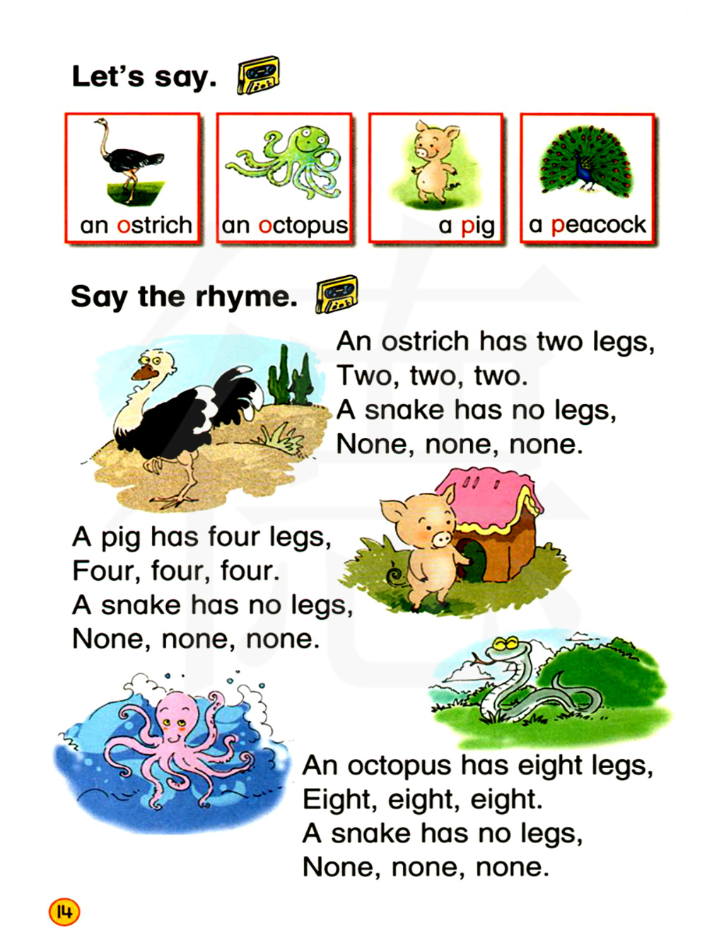 一只鸵鸟两条腿,二,二,二。一条蛇没有腿,无,无,无。一只猪有四条腿, 四,四,四。一条蛇没有腿,无,无,无。一条章鱼八条腿,八,八,八。一条蛇没有腿。无,无,无。