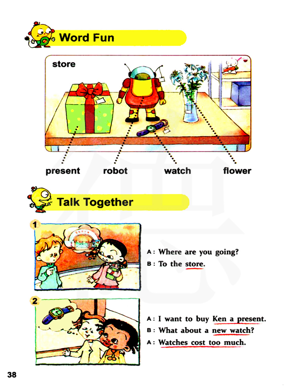 我想给肯买一份礼物。 一块新手表怎么样? 手表要花太多钱了。