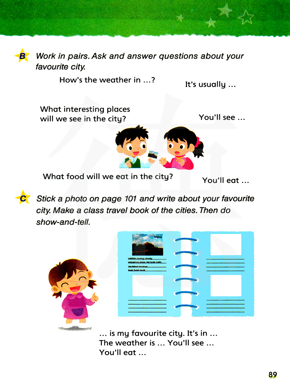 在101页贴一张照片并写写你最喜欢的城市,制作一本班级城市旅游册,然后进行展示并讲述。