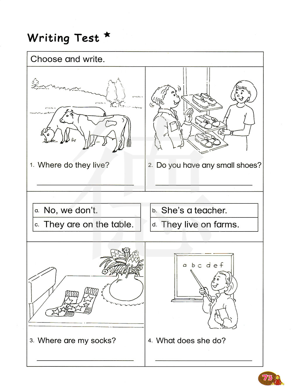 它们住在哪里?它们住在农场。你们有小的鞋子卖吗?不,我们没有。我的袜子在哪里?它们在桌子上。她是做什么的?她是一名老师。