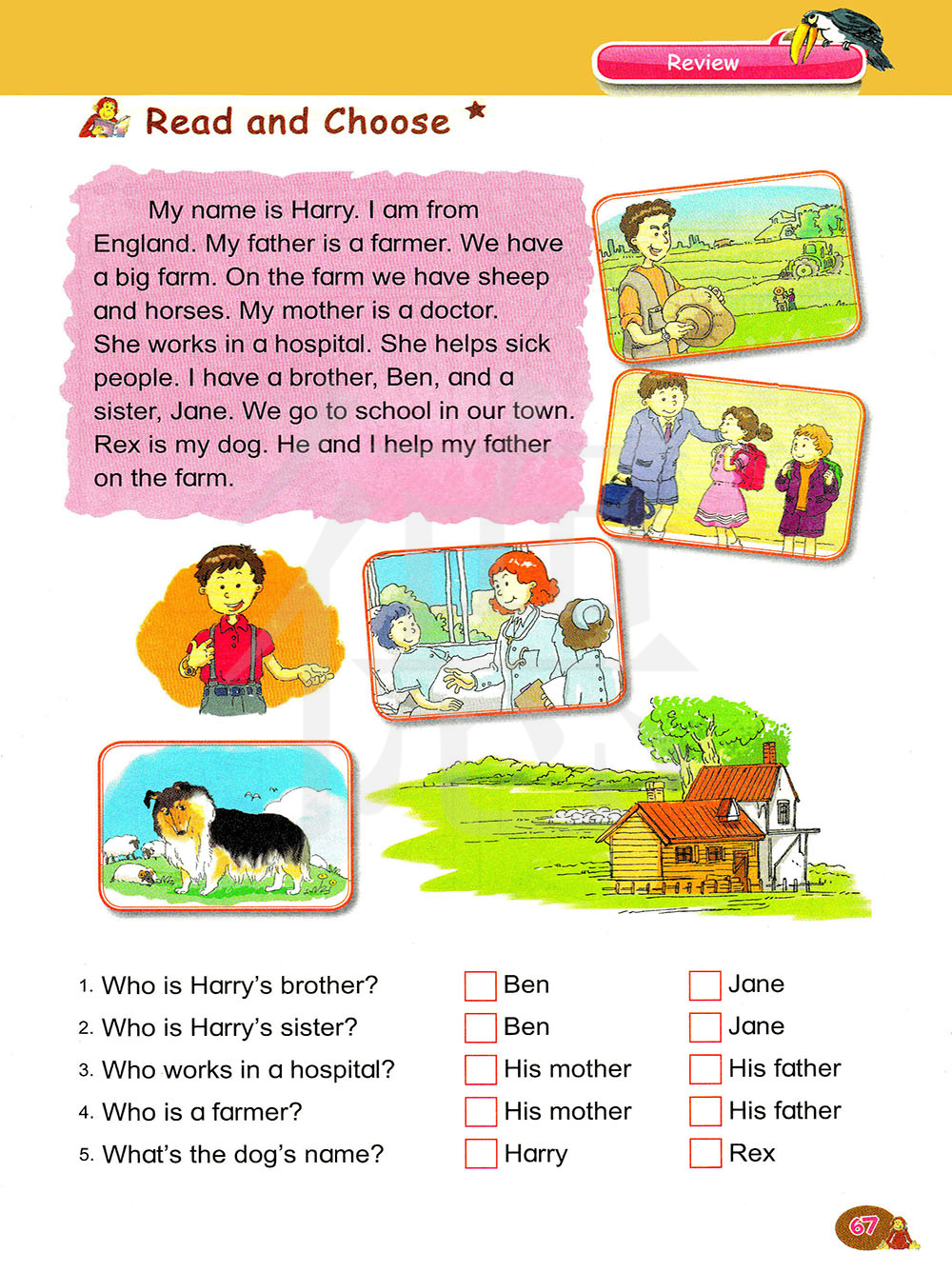 我的名字叫哈里,我来自英国,我的爸爸是一个农民,我们有一个大的农场,在农场里,我们有绵羊和马。我的妈妈是一名医生,她在医院工作,她救治病人。我有一个弟弟,本,还有一个妹妹,简,我们在我们的城镇上学,雷克斯是我的狗,它和我在我爸爸的农场帮忙。