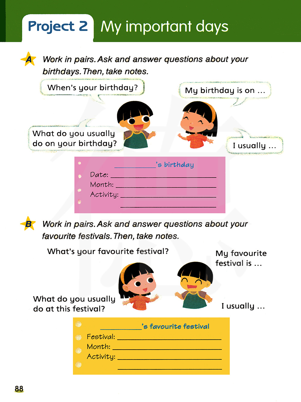 小组练习。提问并回答关于你们的生日的问题。然后,做笔记。