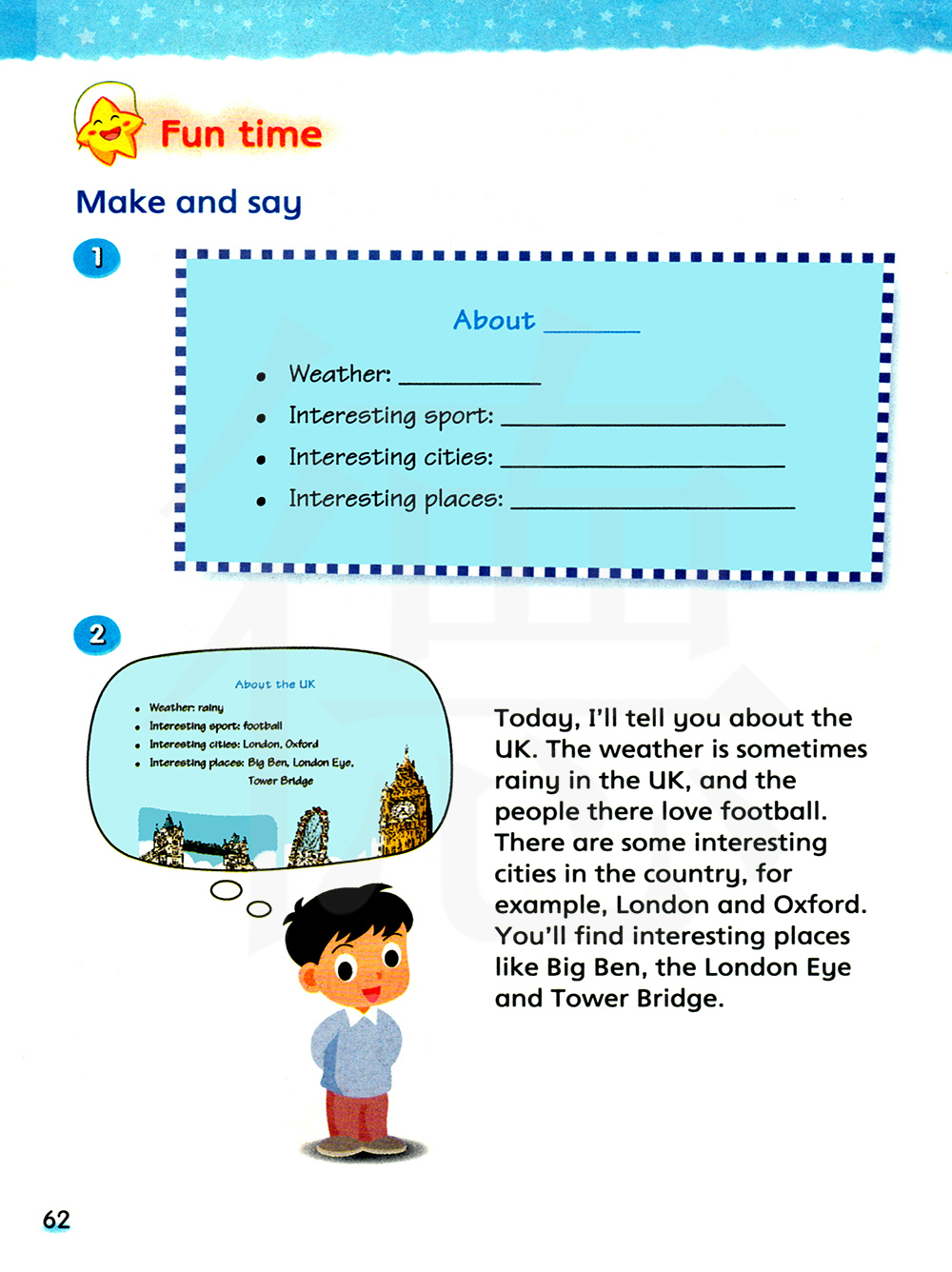今天,我要跟你讲讲英国,在英国,天气有时候多雨,那儿的人们喜爱足球,这个国家有一些有趣的城市,例如:伦敦和牛津,你将会发现有趣的地方,如大本钟、伦敦眼和塔桥。