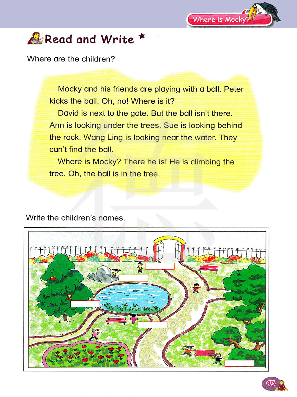 大卫在门的旁边,但是球不在那里,安在树下找,苏在岩石后面找,王玲在水池附近找,他们找不到球。