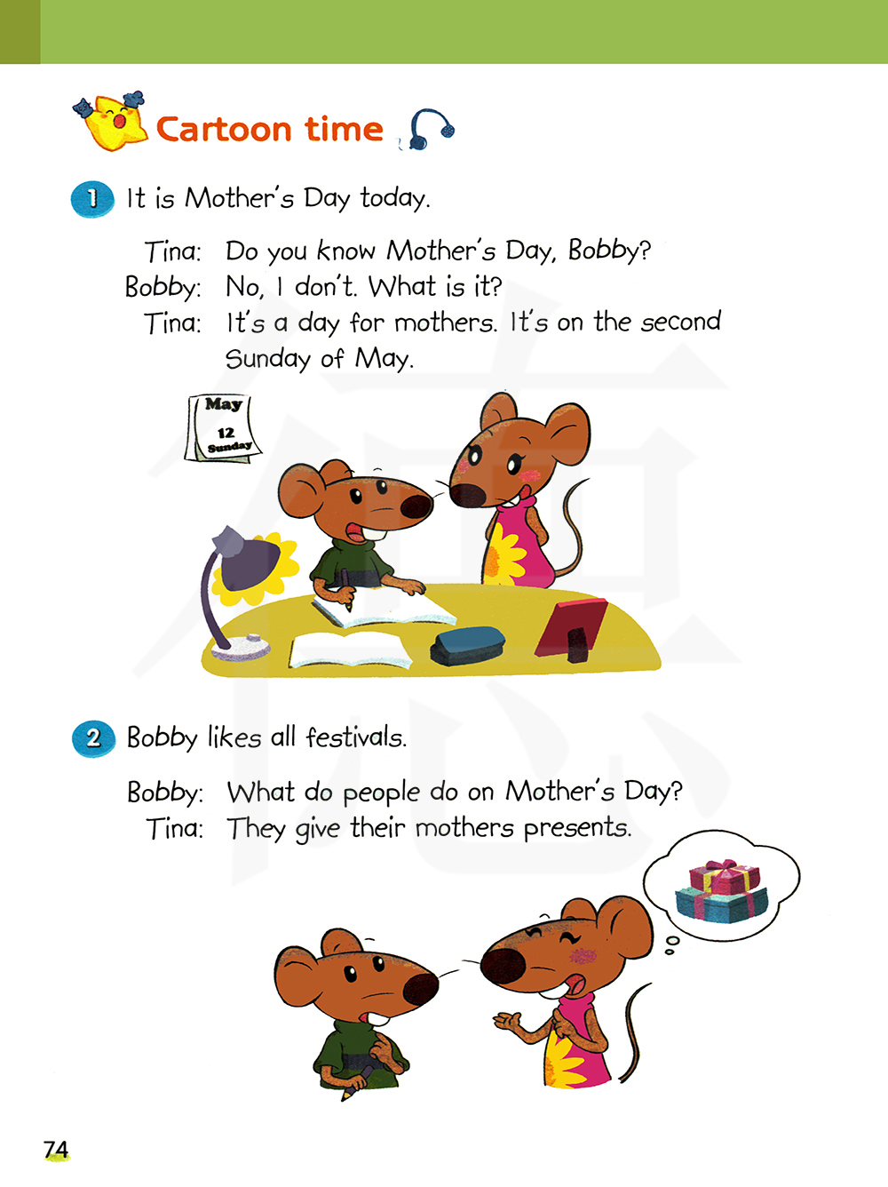波比,你知道什么是母亲节吗?我不知道。什么是母亲节?这是关于母亲的节日。它通常在五月的第二个星期日。