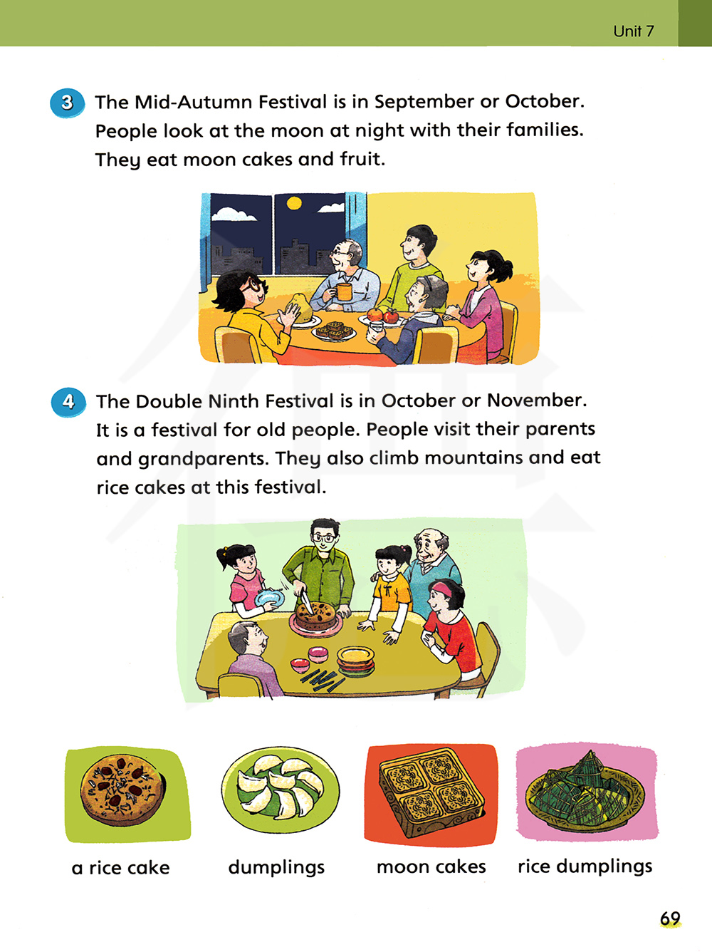 look at the moon  赏月  at night  在夜里  eat moon cake  吃月饼 Double Ninth Festival 重阳节    old people 老人