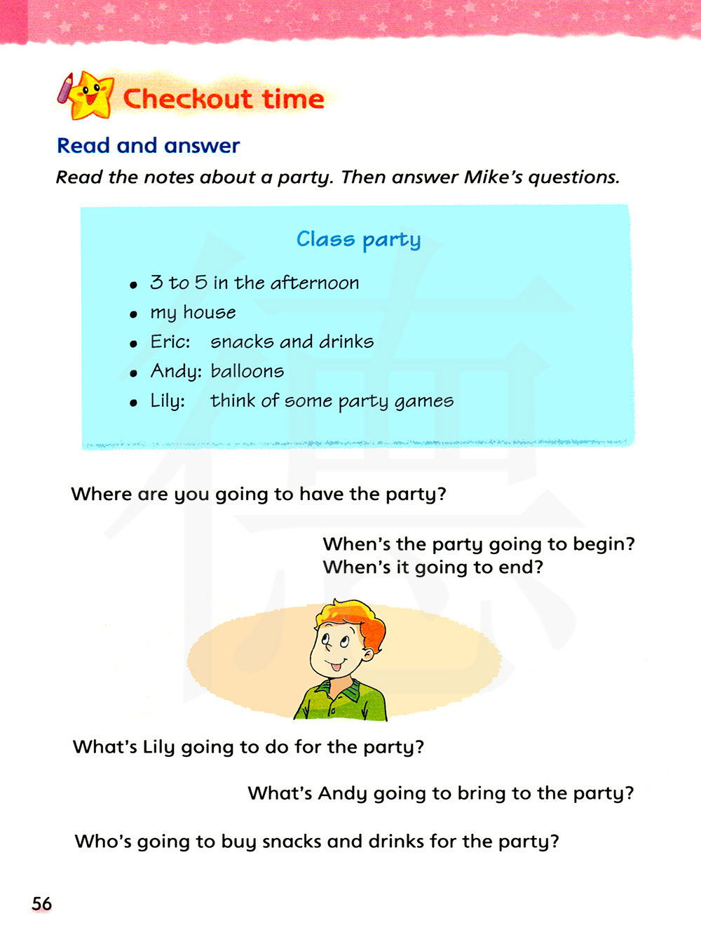 读有关派对的笔记。然后回答迈克的问题。