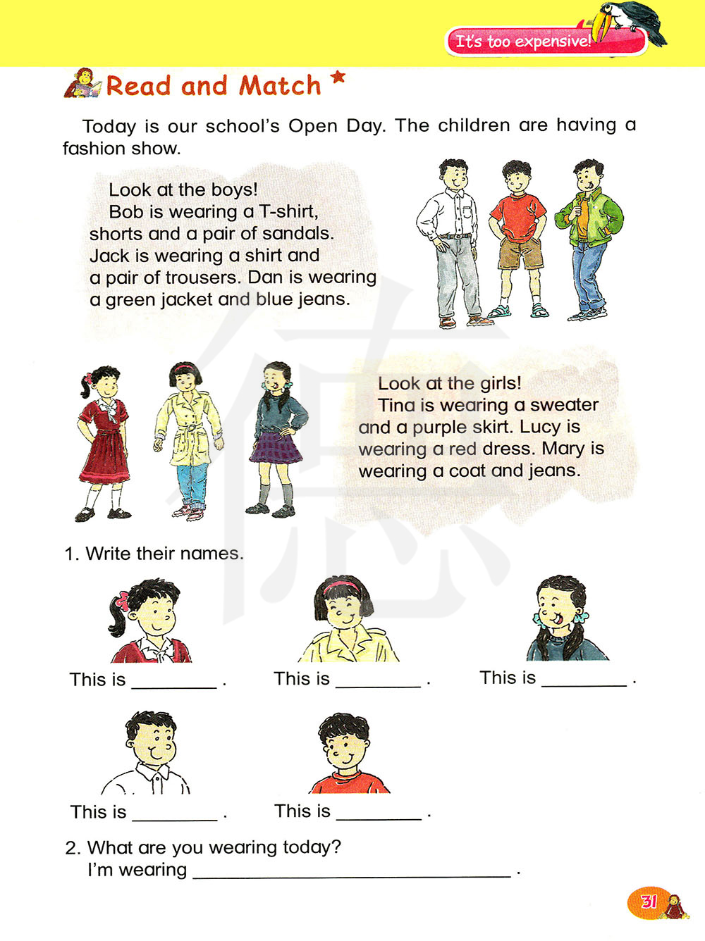看看这些男孩!鲍勃穿着一件T恤衫、一条短裤和一双凉鞋。杰克穿着一件衬衫和一条长裤。丹穿着一件绿色的夹克和一条蓝色的牛仔裤。