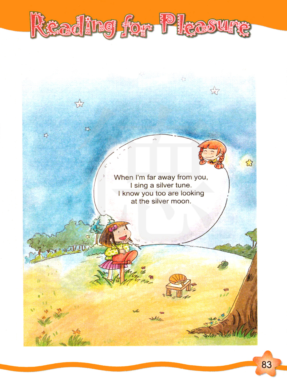 当我离你很远的时候,我唱一首银色的曲调。我知道你在看银色的月亮。
