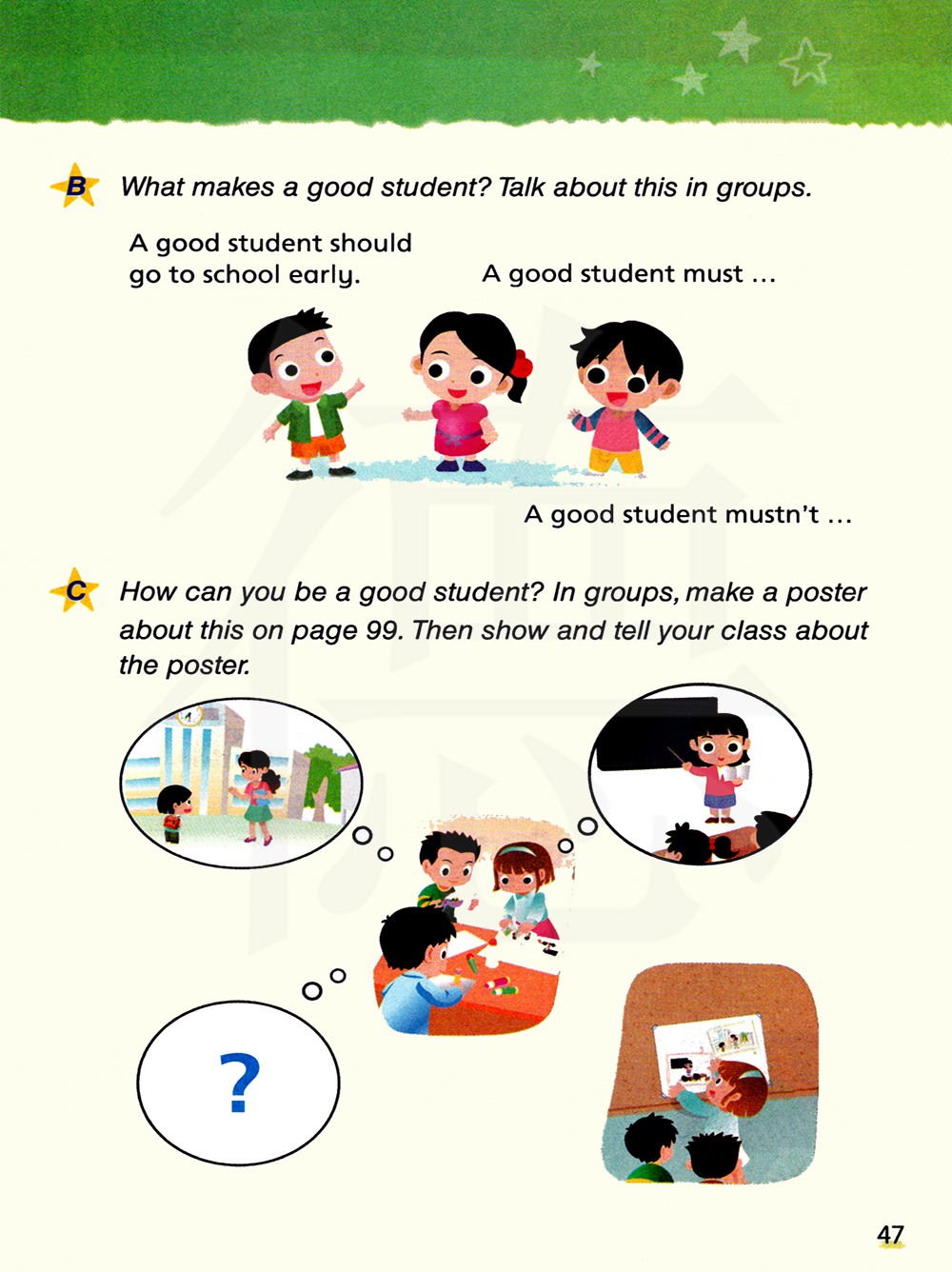 你怎样才能当一名好学生呢?以小组为单位,在99页制作有关这个的海报,然后给你的全班同学展示并讲述这个海报。
