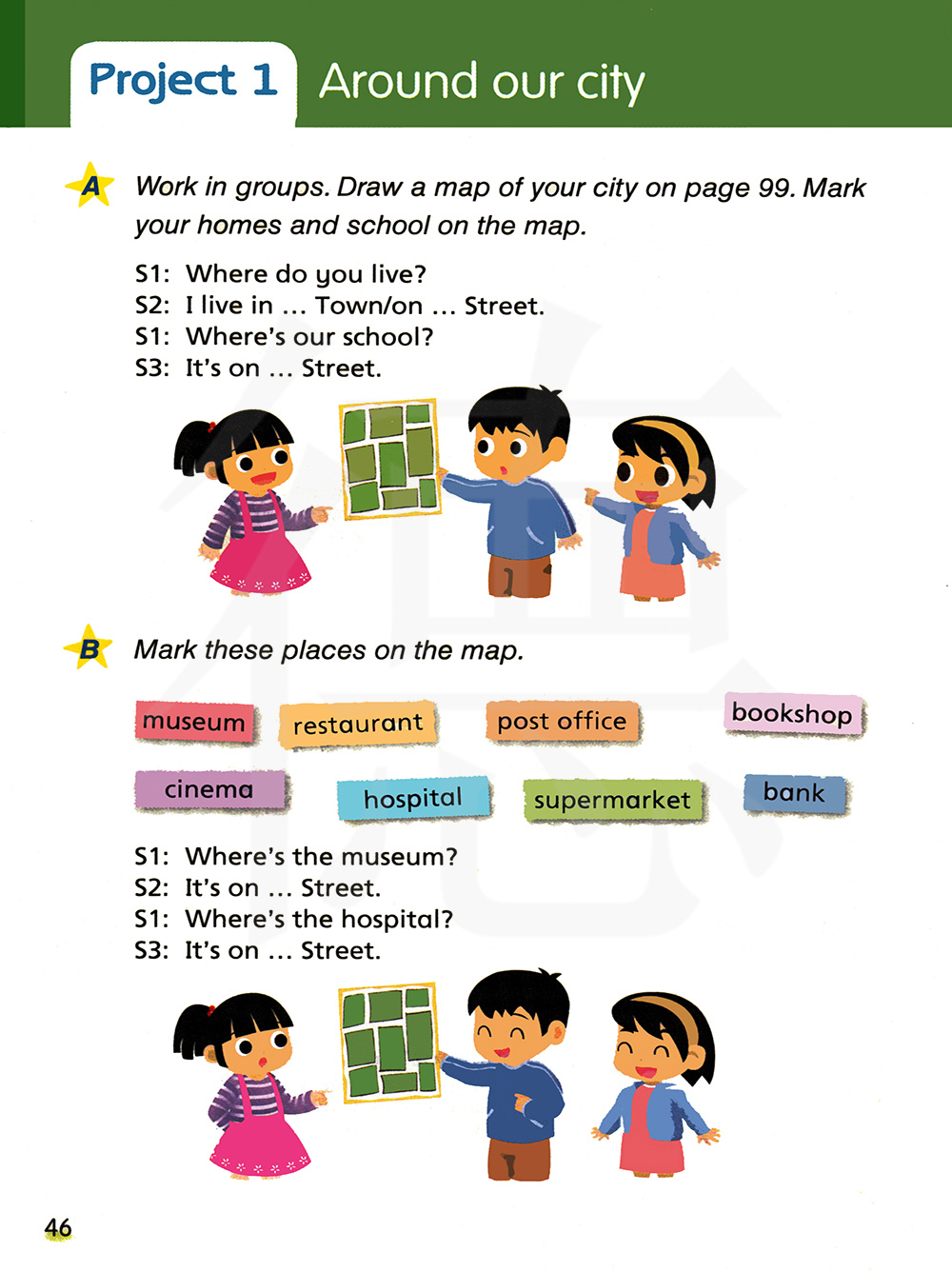 小组练习。在第99页画一张你所在城市的地图。在地图上标记出你的家和学校。