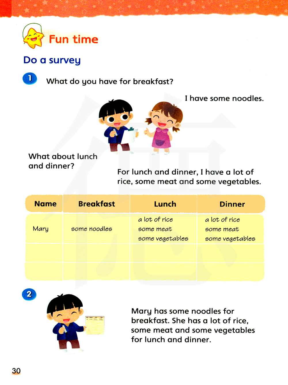 玛丽早餐吃一些面条,午餐和晚餐她吃很多米饭,一些肉和一些蔬菜。