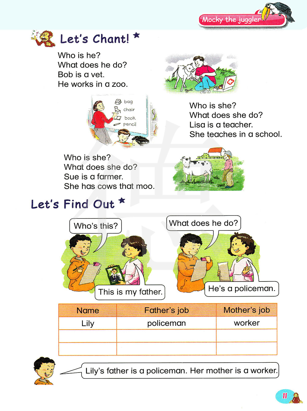 他是谁?他是做什么的?鲍勃是一名兽医。他在动物园工作。她是谁?她是做什么的?丽莎是一名老师。她在学校教书。她是谁?她是做什么的?苏是一个农民。她有哞哞叫的奶牛。
