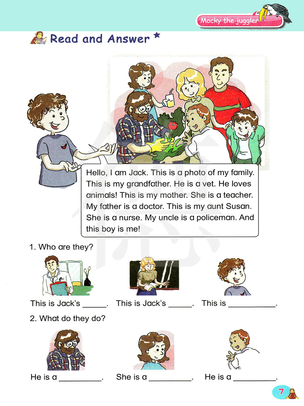 你好,我是杰克。这是我家的一张照片。这是我的爷爷,他是一名兽医,他很喜欢动物。这是我的妈妈,她是一名老师。我的爸爸是一名医生,这是我的阿姨苏珊,她是一名护士。我的叔叔是一名警察。还有这个男孩是我!
