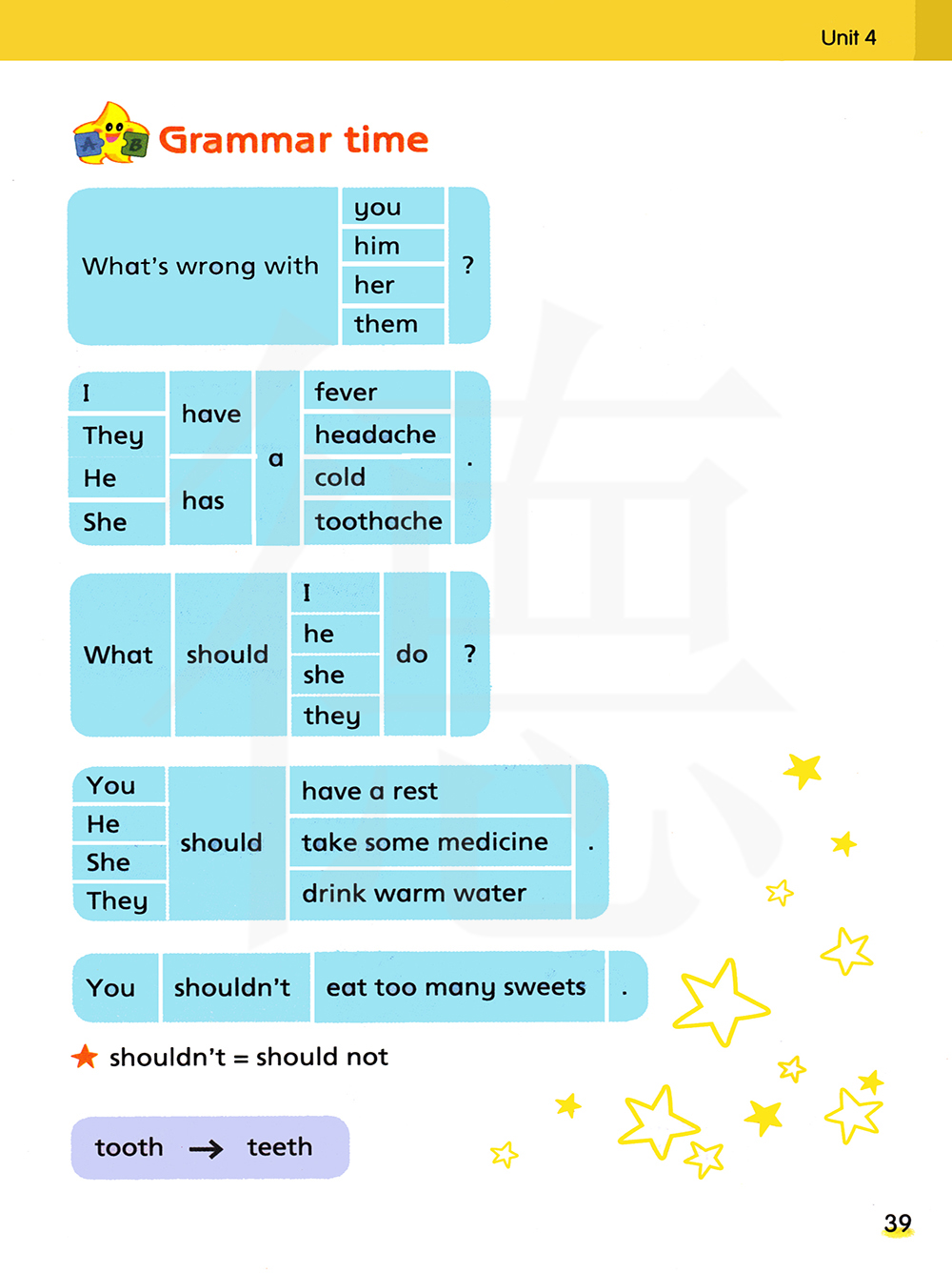你应该休息。他应该吃些药。她应该喝热水。他们应该休息。