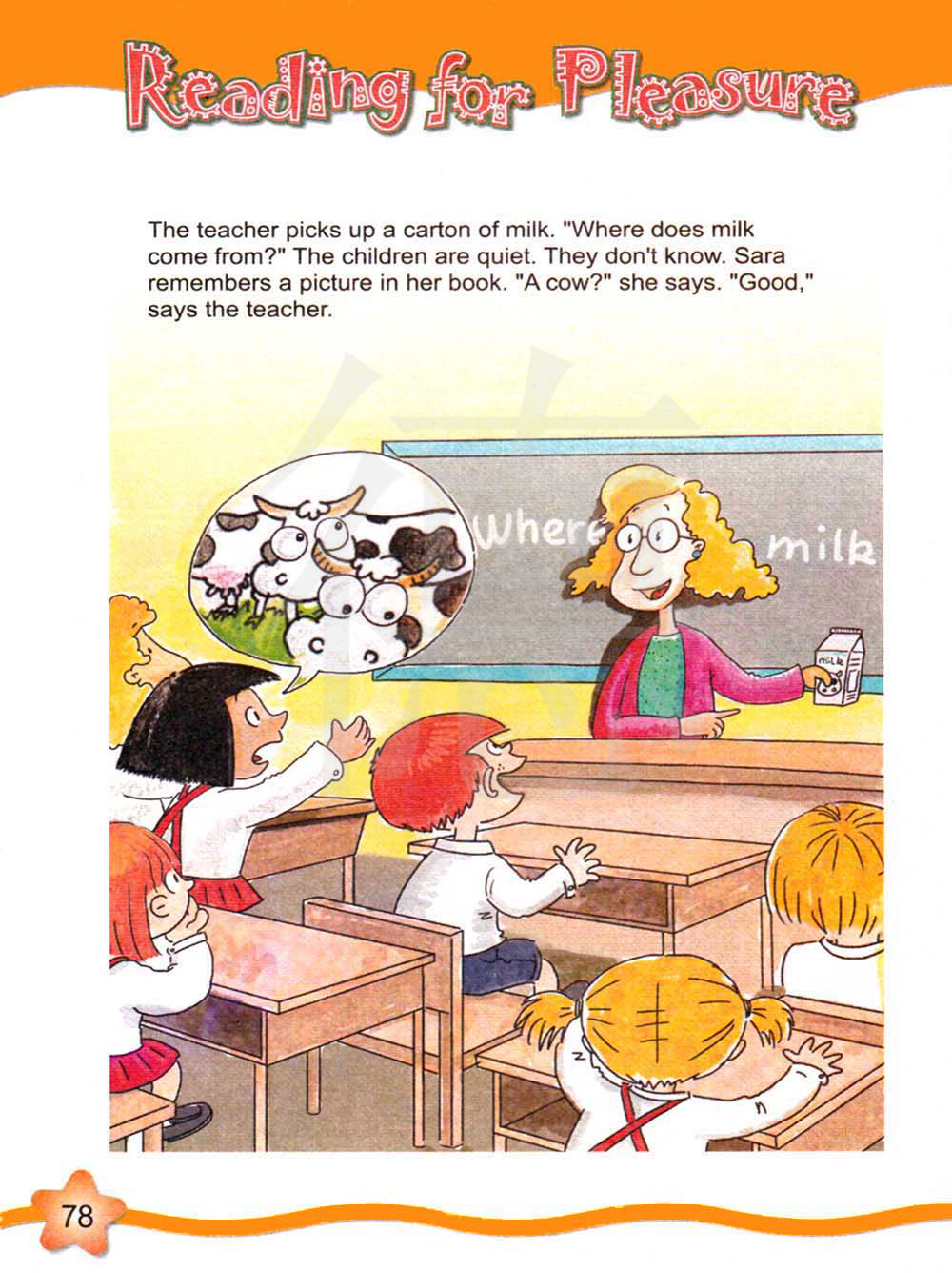 老师拿起了一盒牛奶。“牛奶来自哪里?”孩子们沉默了。他们不知道。萨拉记起了她书中的一幅图片。“一头奶牛?”她说。“很好,”老师说。