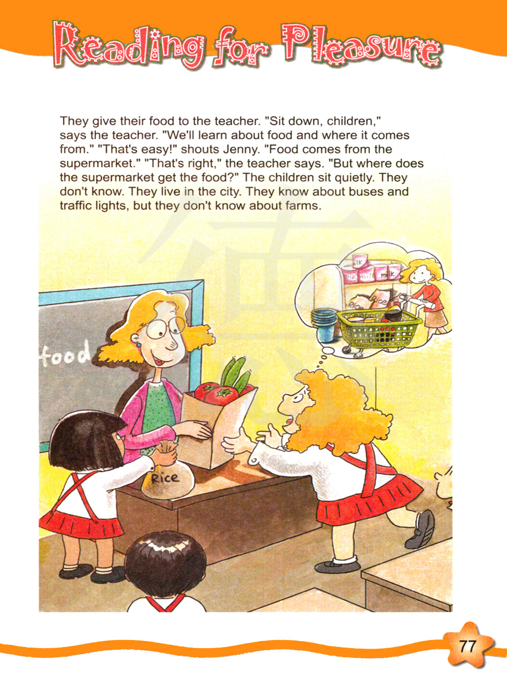 他们把他们的食物给了老师。“坐下,孩子们,”老师说。“我们要了解食物以及它是从哪里来的。”“那很容易!”詹妮叫道。“食物是从超市来的。“说得对,”老师说。“但是超市是从哪里得到的食物呢?”孩子们静静的坐着。他们不知道。他们住在城市里。他们知道公交车和红绿灯,但是他们不知道农田。