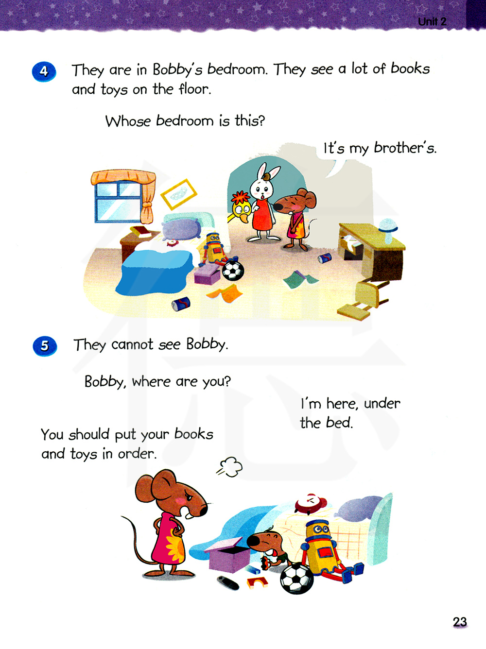 他们来到波比的卧室。他们看见地上有很多书和玩具。