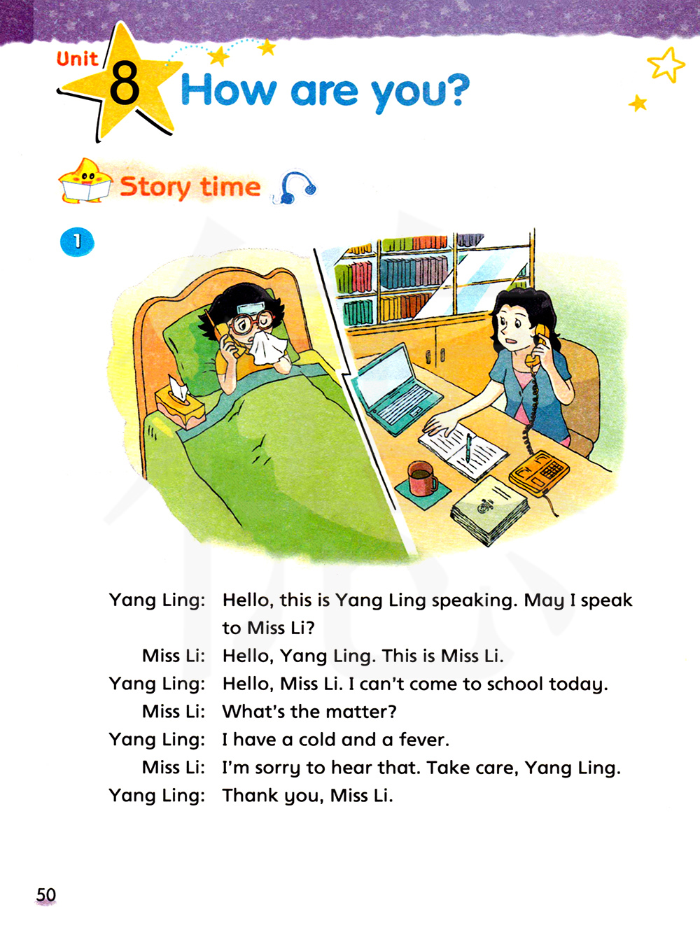 我感冒了,在发烧。听到这个消息我很难过,杨玲,照顾好自己。李老师,谢谢你。