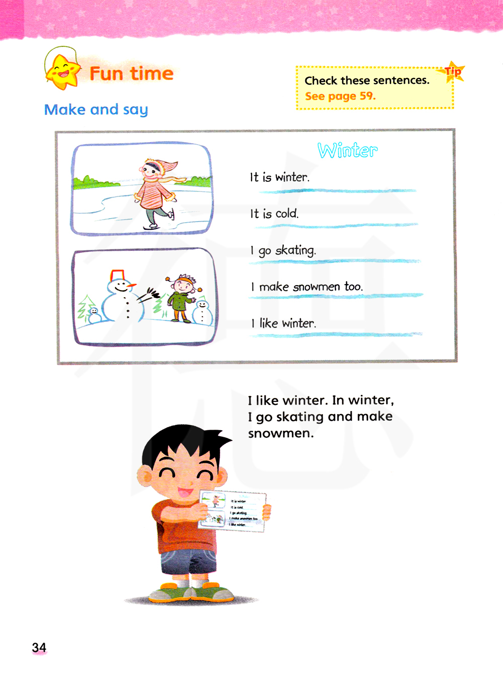 我喜欢冬天。冬天,我滑冰并且堆雪人