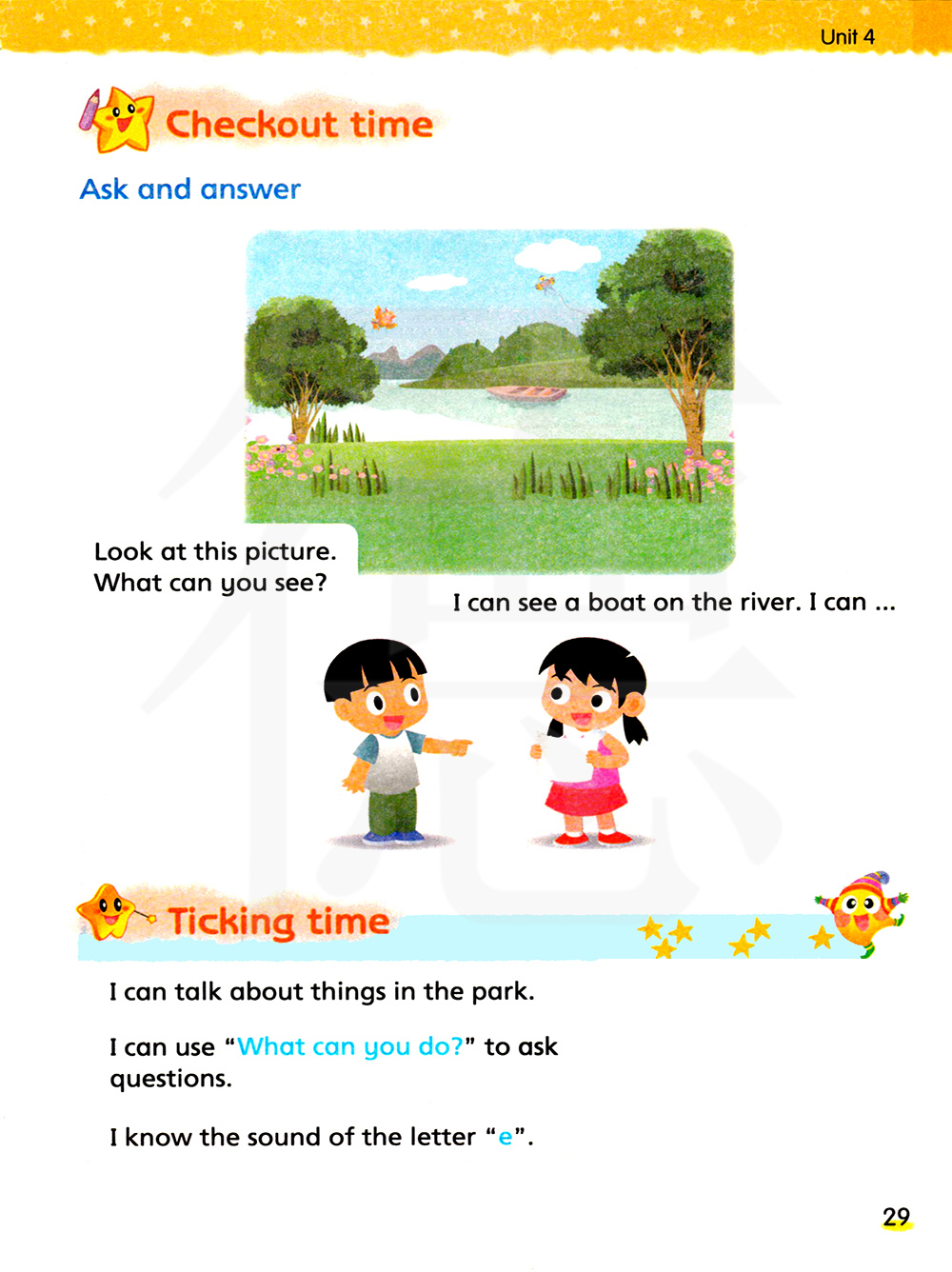 我能看到河面上有一条船。我能…