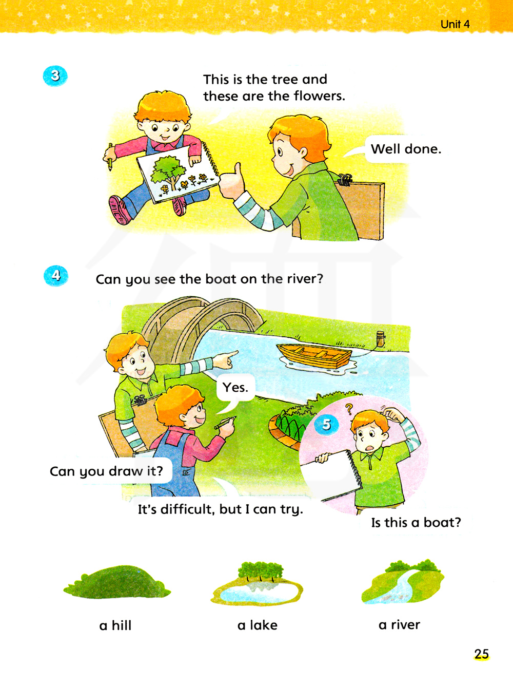 can you draw 你会画吗?          in the boat 在小船里                       drawing in the park 在公园里画画    a tree 一棵树