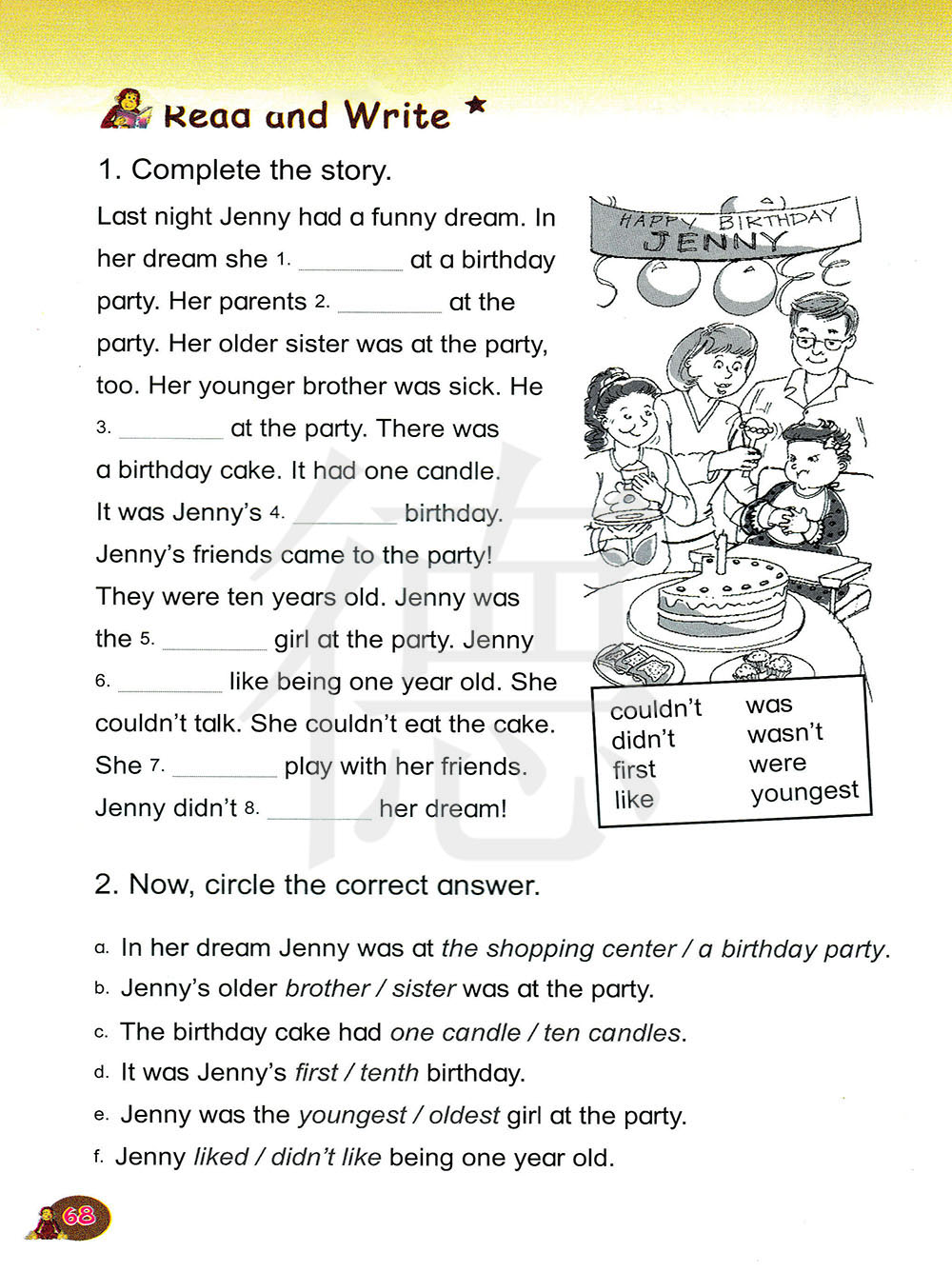昨晚詹妮做了一个有趣的梦,在她的梦里,她在一个生日派对上,她的爸爸妈妈在派对上,她的姐姐也在派对上,她的弟弟生病了,他不在派对上,有一个生日蛋糕,上边有一根蜡烛,这是詹妮的第一个生日,詹妮的朋友们来参加了派对,他们十岁了,詹妮是派对上年龄最小的女孩,詹妮不喜欢变成一岁,她不能说话,她不能吃蛋糕,她不能喝她的朋友们玩耍。詹妮不喜欢她的梦。