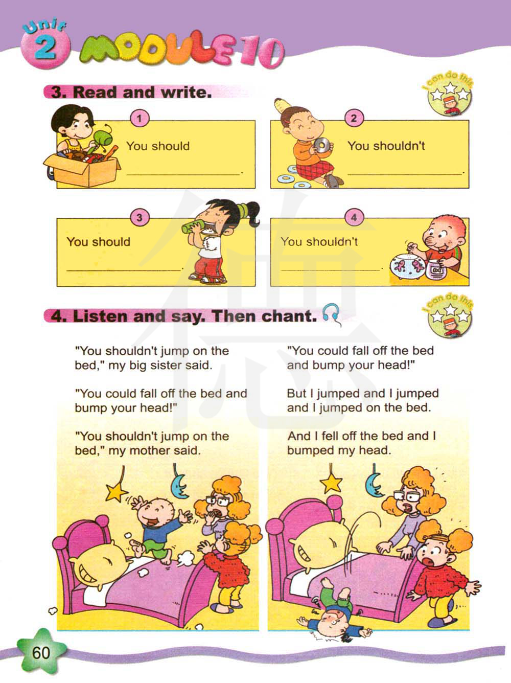 “你不应该在床上跳,”我的姐姐说。“你会掉下床并撞到脑袋的!”“你不应该在床上跳。”我的妈妈说。“你会掉下床并撞到脑袋的!”但是我在床上跳啊跳啊跳啊。然后我就掉下床并撞到了脑袋。