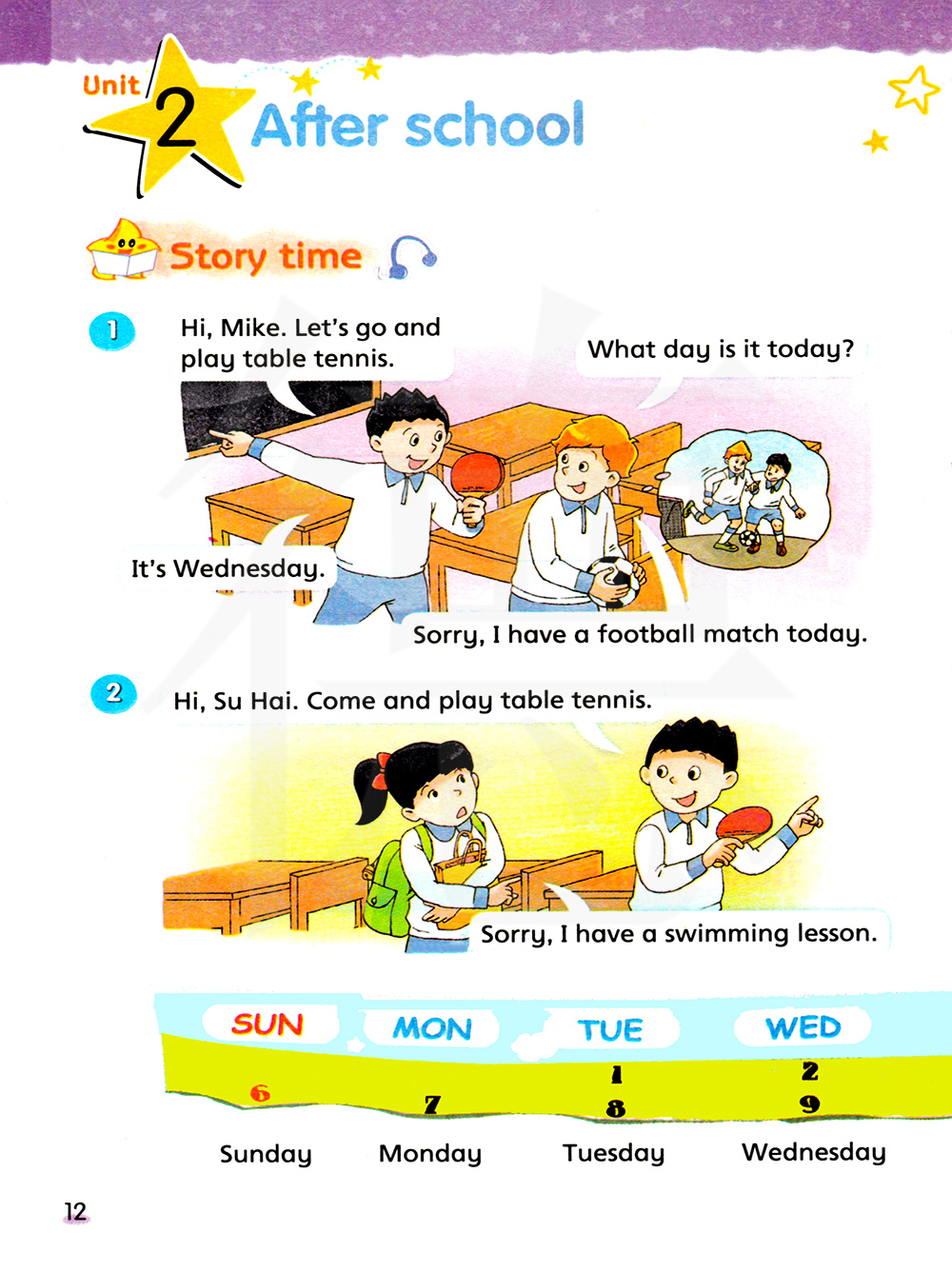 lessons  什么课 on Saturday     在星期六                  play table tennis 打乒乓球         what day is it today?  今天星期几?         come and