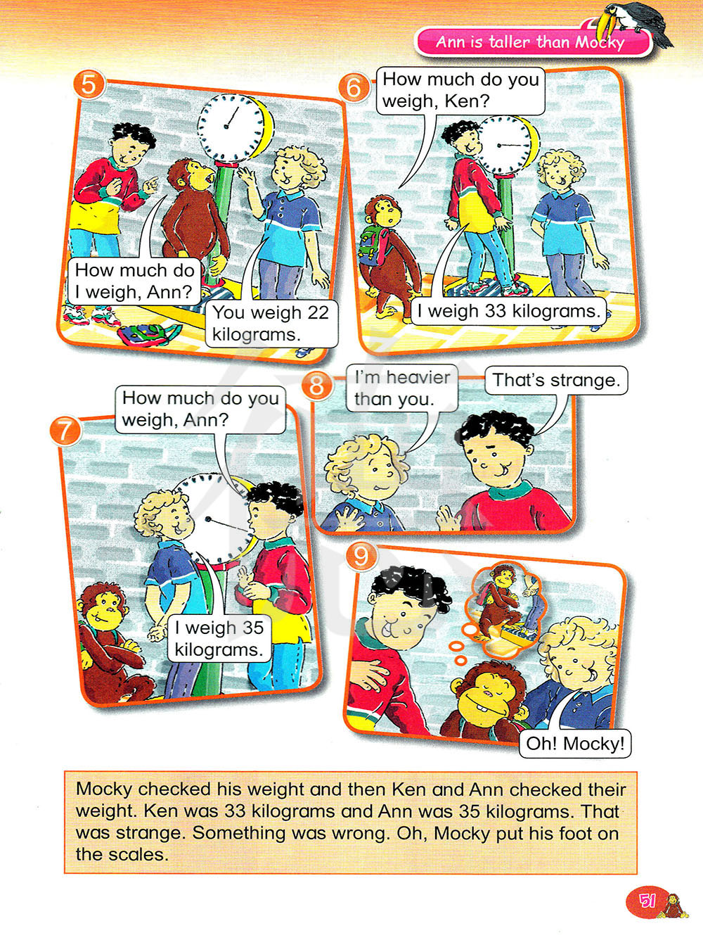 莫奇测量了他的体重。然后肯和安测量了他们的体重,肯有33公斤重,安有35公斤重。太奇怪了。一定是出了什么问题,噢,莫奇把他的脚放在称上了。