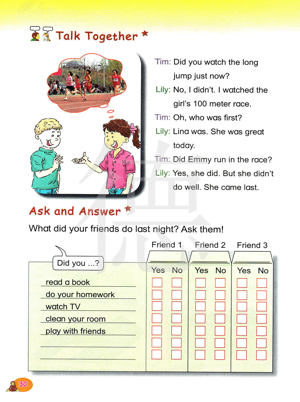 你看了刚才的跳远比赛吗?不,我没有。我看了女子一百米赛跑。