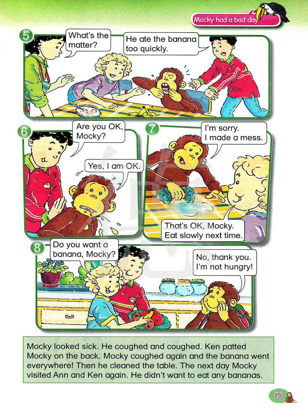 莫奇看上去不舒服,他不停的咳嗽。肯拍了拍莫奇的背。莫奇再次咳嗽并把香蕉喷的到处都是。然后,他清理的桌子。第二天,莫奇又去看望安和肯,他再也不想吃香蕉了。