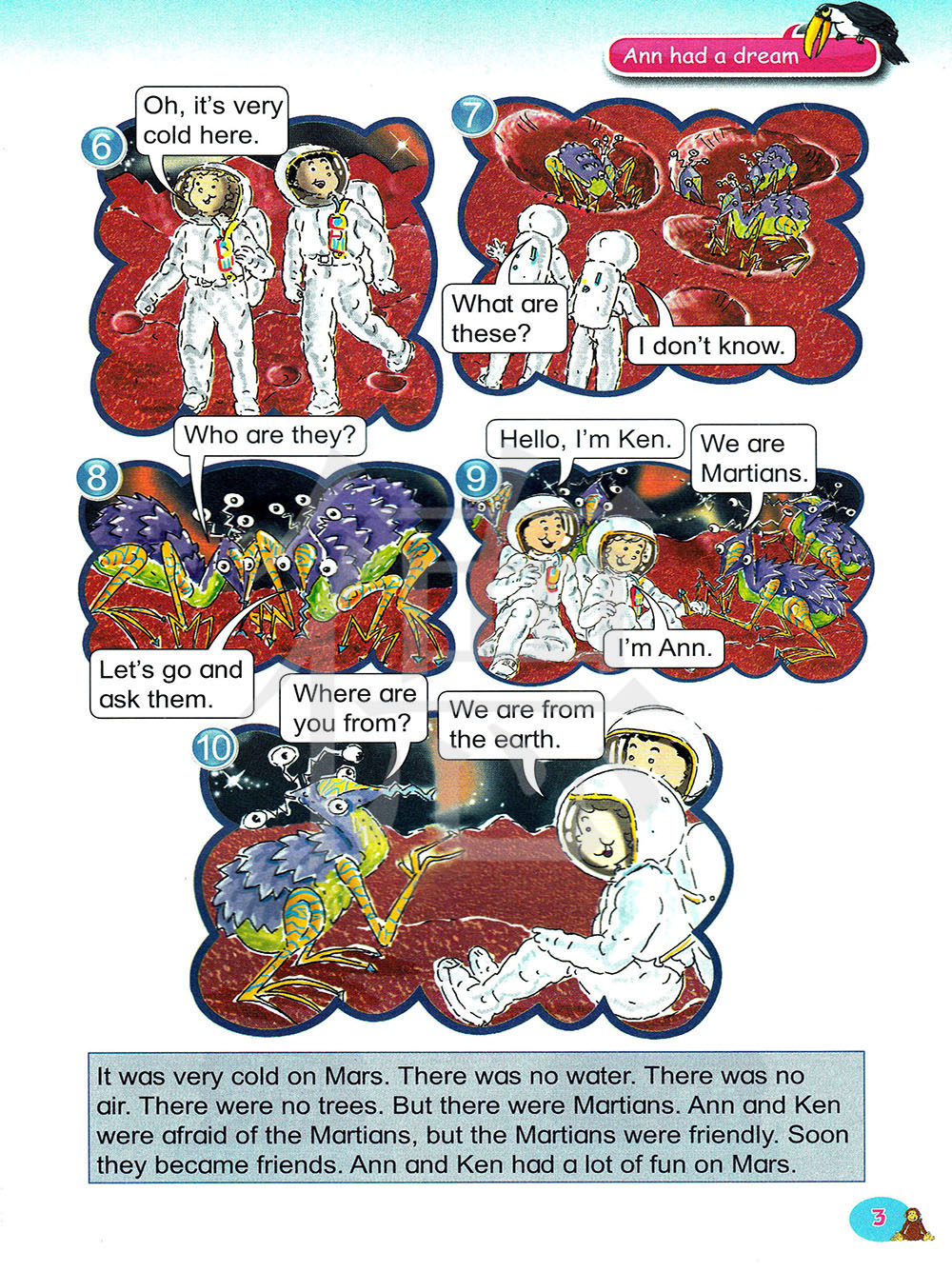 火星上非常冷。没有水,没有空气,没有树,但是有火星人,安和肯害怕火星人,但是他们很友好。不久,他们成为了朋友,安和肯在火星上玩的很开心。
