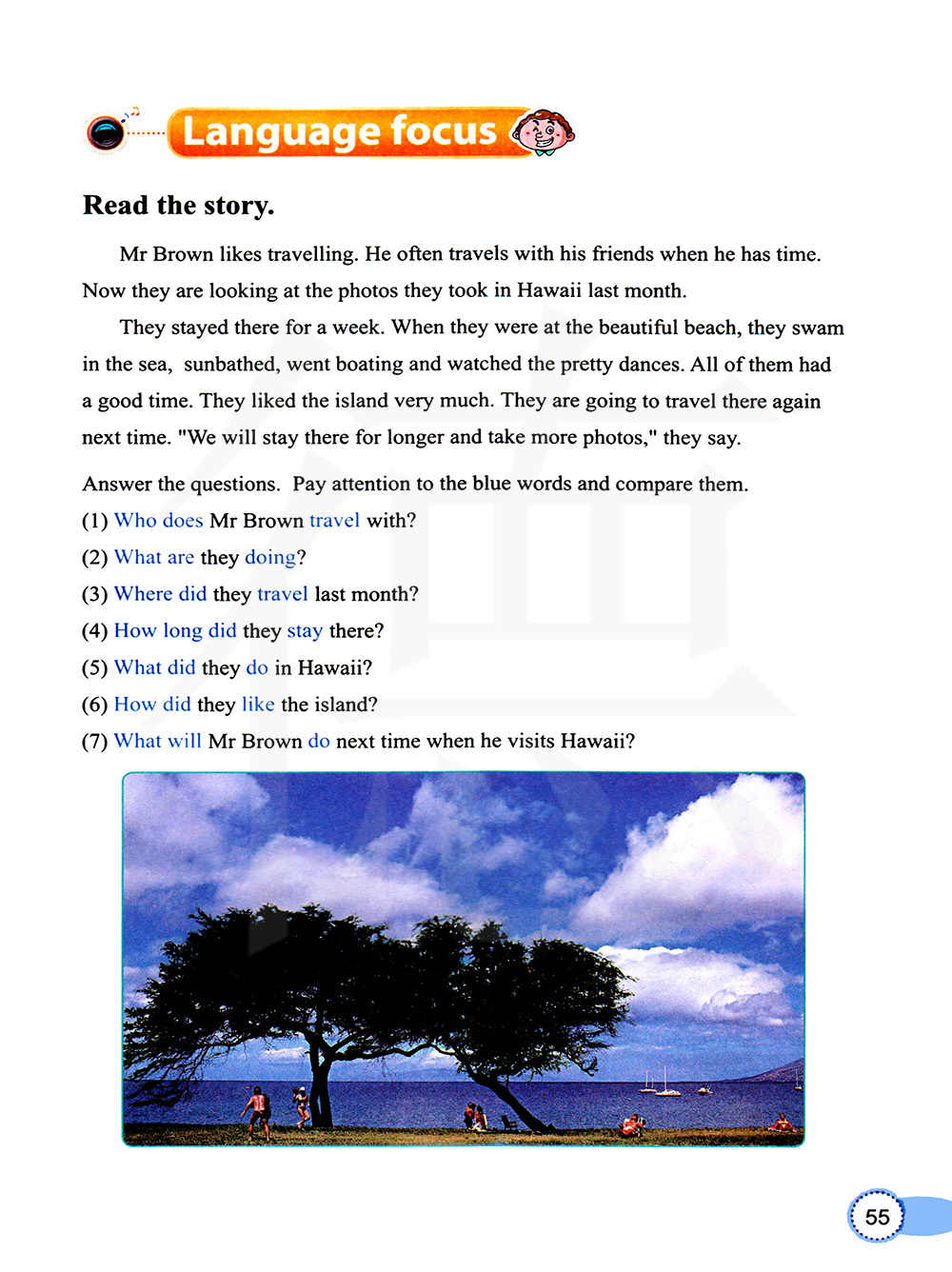 布朗先生喜欢旅行。他有时间的时候,经常和他的朋友一起去旅行。 现在他们正在看他们上个月在夏威夷拍的照片。