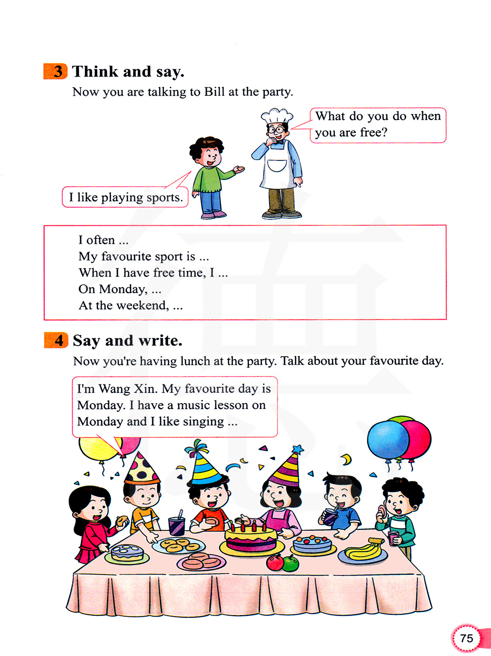 我是王新。我最喜欢的一天是星期一。我星期一有一节音乐课,我喜欢唱歌......