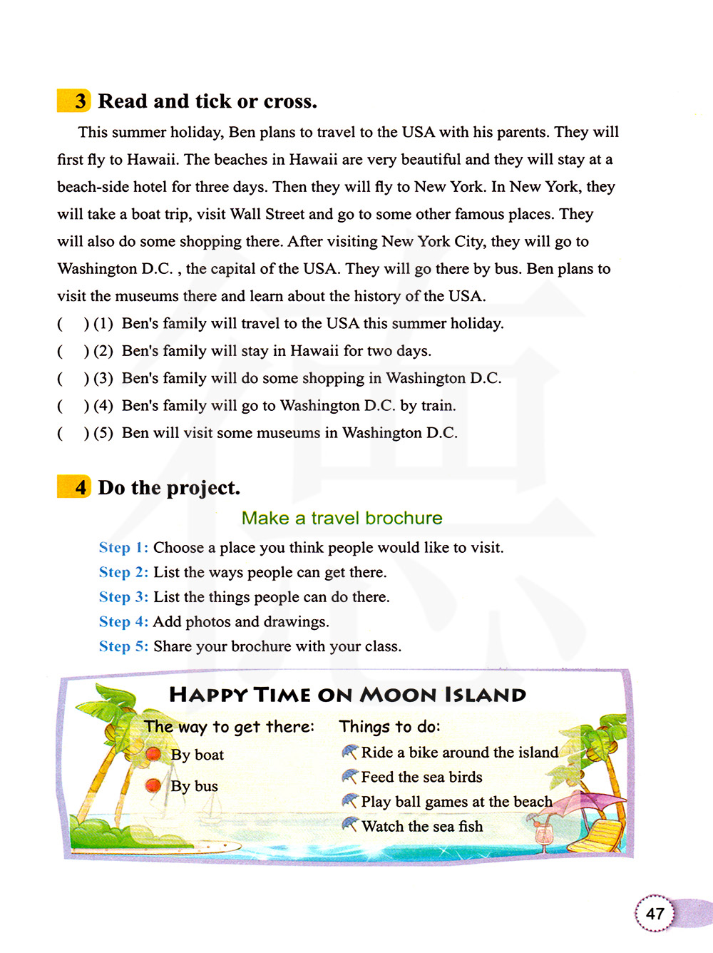 步骤三:列举在那里人们可以做的事情。 步骤四 添加照片和图画 步骤五 和同学们分享你的小册子。