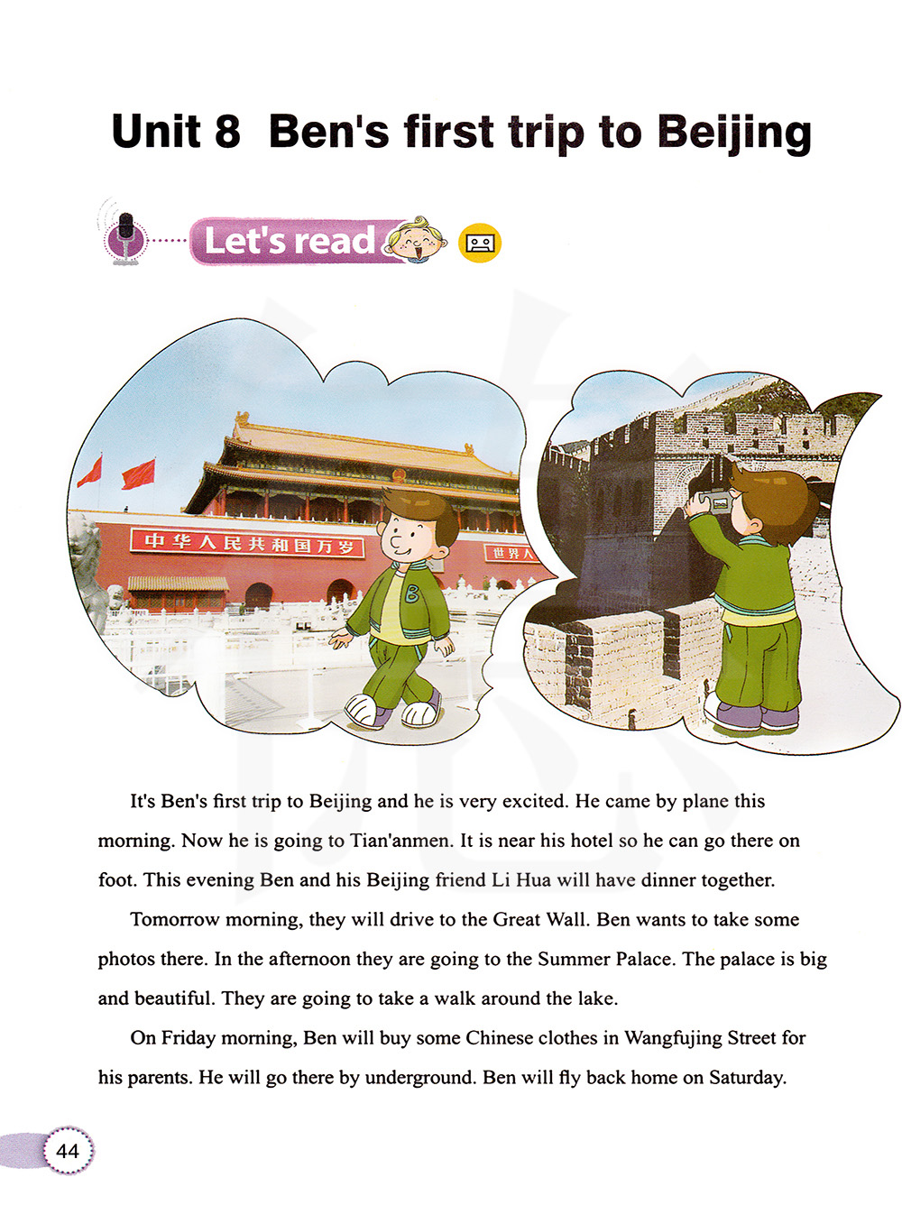 这是本第一次到北京旅行,他很激动。 他今天上午乘飞机来的。 现在他要去天安门。天安门就在他的旅馆附近, 因此他可以步行去那儿。今晚,本将和他的北京朋友李华一起吃晚餐。