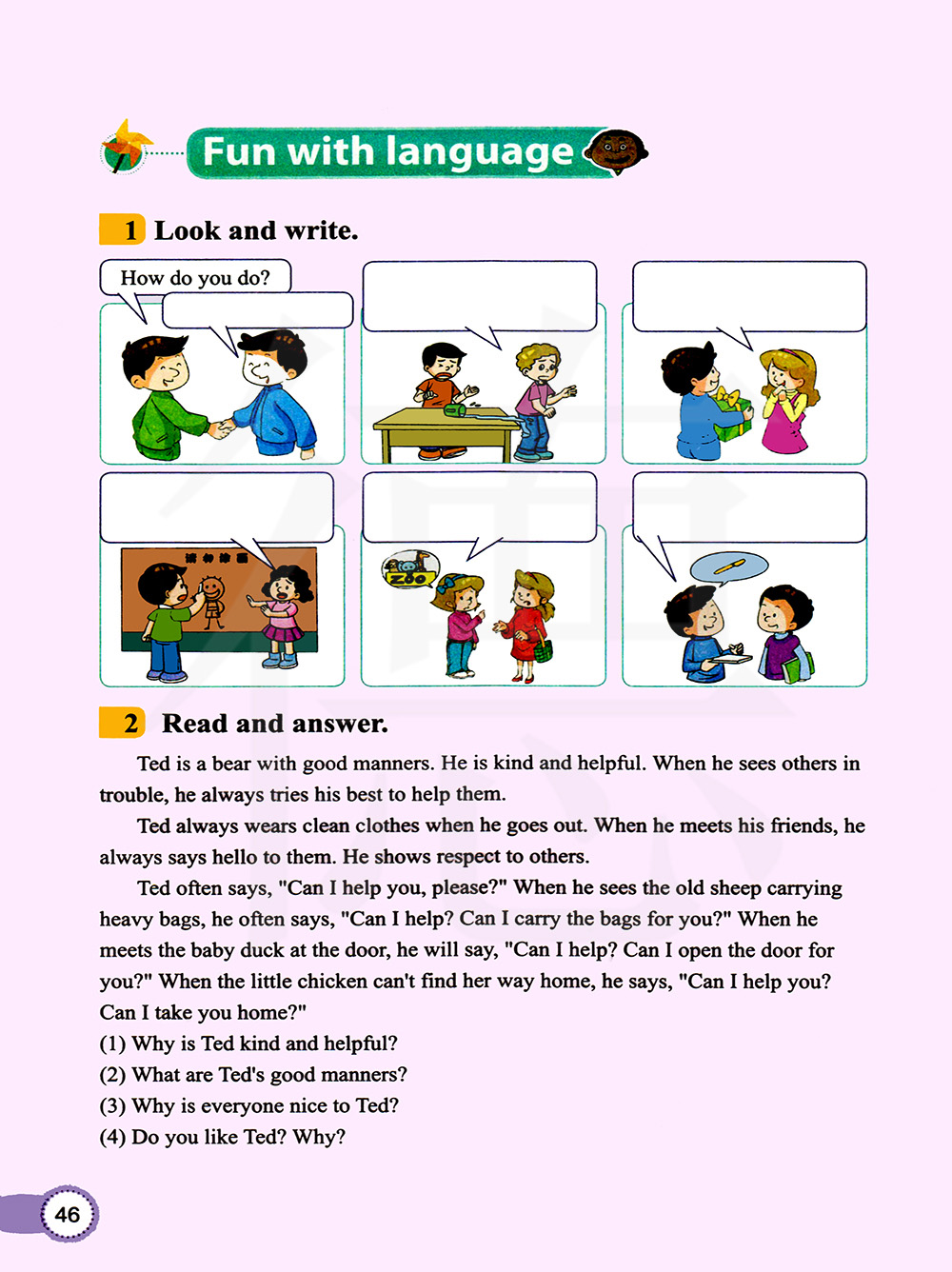 泰德总是说:“请问我可以帮助你吗?”他看见老羊扛沉重的袋子时,他经常说:“我可以帮忙吗?我可以帮你扛袋子吗?”他看见小鸭子在门旁边时,他会说:“我可以帮忙吗?我可以为你开门吗?”当小鸡找不到回家的路过时,他会说:“我可以帮你吗?我可以送你回家吗?”