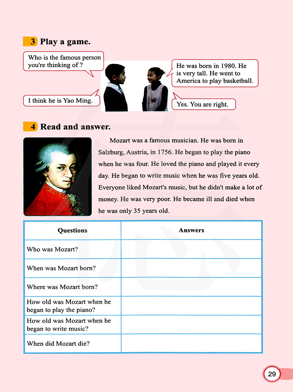 莫扎特是一位著名的音乐家。他于1756年出生于奥地利的萨尔斯堡。当他四岁时他开始弹钢琴。他喜欢钢琴并且每天弹奏它。当他五岁时,他开始创作音乐。每个人都喜欢莫扎特的音乐,但是他没有赚很多钱。他非常穷。当他只有35岁时他生病并且去世了。