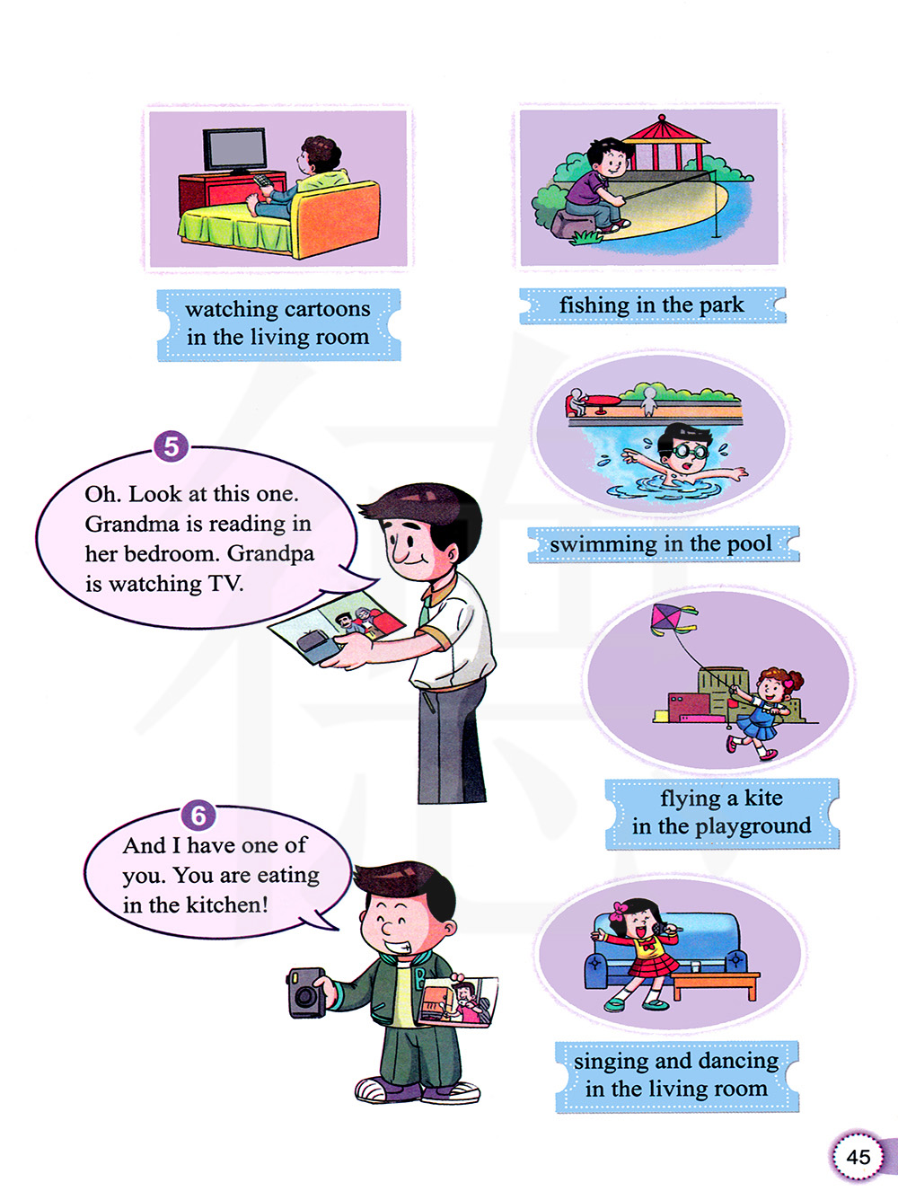 噢,看这张,奶奶在她的卧室里看报纸。爷爷在看电视