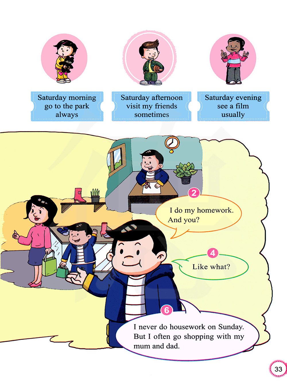 我星期天从不做家务,但是我经常和我爸爸妈妈去购物