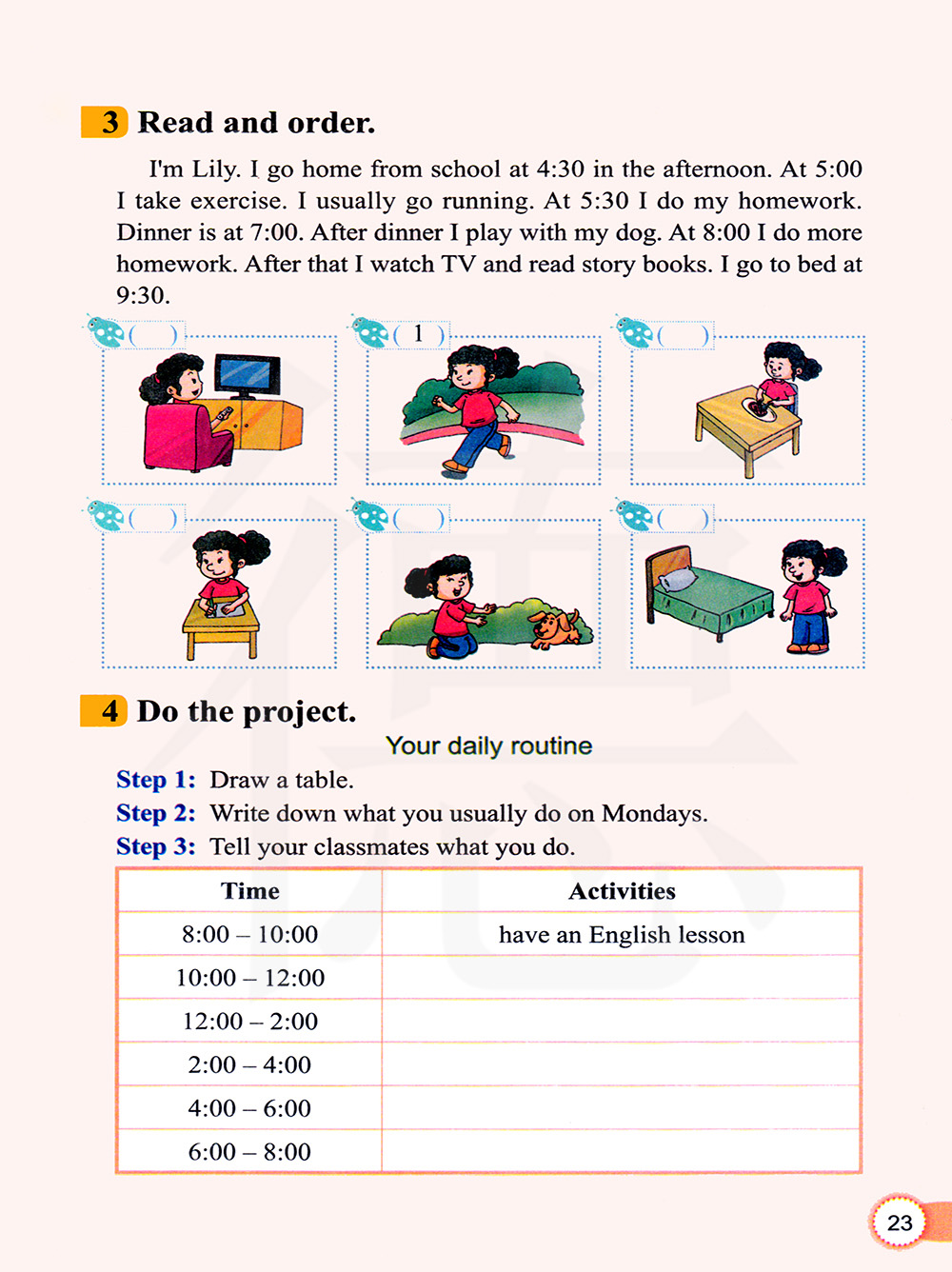 我是莉莉。我下午四点半从学校回家,五点钟锻炼。我通常去跑步,五点半的时候我做作业。晚餐是七点钟吃。吃过晚饭我就和我的狗狗玩。八点我做家庭作业。之后我就看电视读故事书。九点半的时候去睡觉。