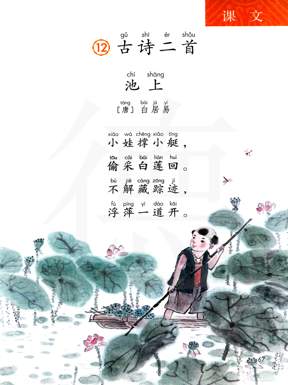 诗人在诗中叙述一个娃娃生活的一件小事:小娃娃瞒着大人偷偷地划着小船去采莲,采到白莲后高兴极了,竟忘记自己是瞒着大人偷偷去的,公然大摇大摆地划着小船回家去,在湖里清晰地留下了他小船经过的痕迹。诗人白居易的诗向来追求“意求深,字求浅”的风格,整首诗虽如同大白话,但极富韵味,充满童趣。第二句的“偷采”和第三句的“不解”,把一个顽皮、天真无邪的小娃娃形象写得呼之欲出,活灵活现。