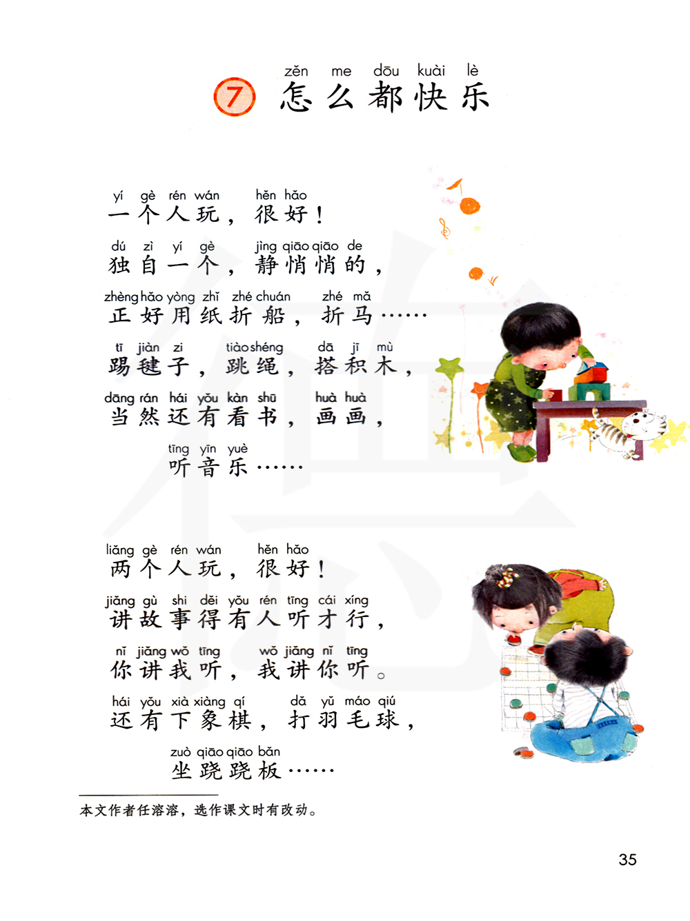 本文让学生感悟到快乐的含义:独处一人是一种快乐,与他人相处也是一种快乐,学会为别人付出更是一种快乐;游戏快乐,学习也快乐。