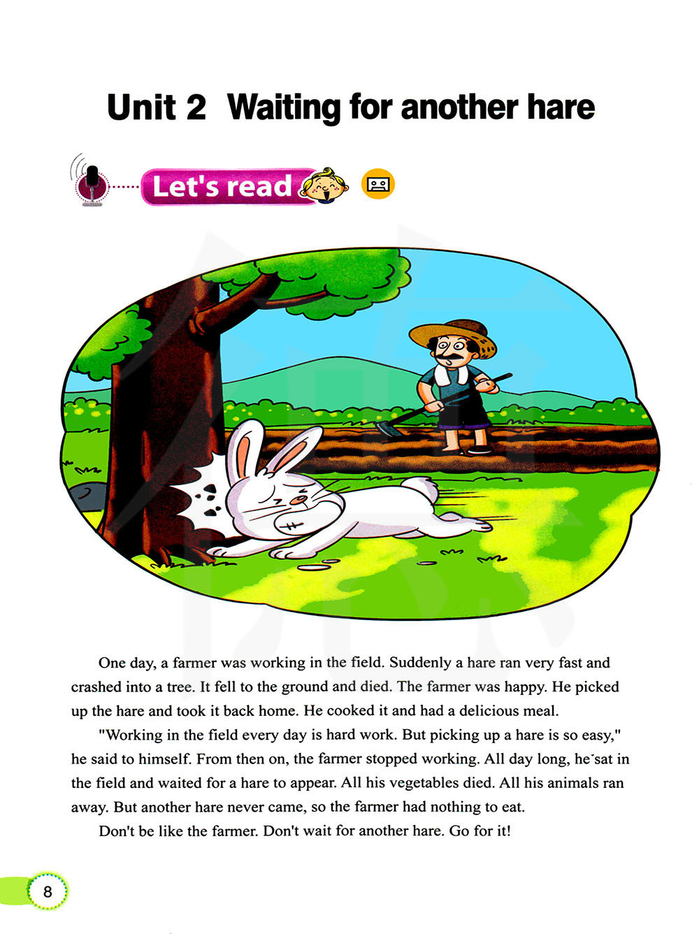9、One day, a farmer was working in the field.使用的是过去进行时态。过去进行时用来讲述过去某个时间正在发生的事情。将现在进行时中的be动词am, is, are变为was,were就构成过去进行时了。例如:They were watching TV when you called.