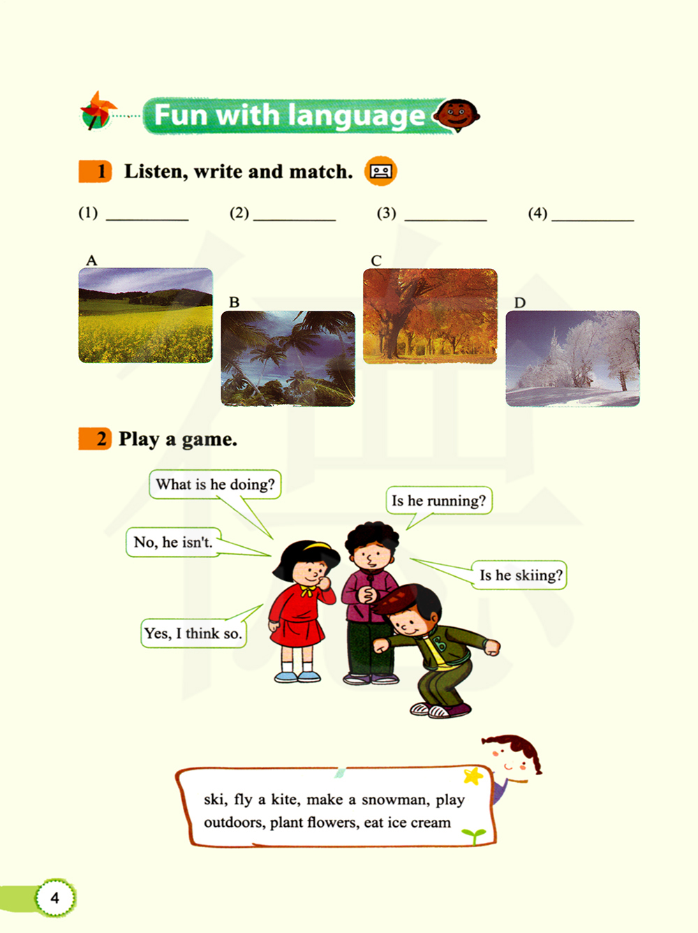 滑雪,放风筝,堆雪人,在户外玩耍,种花,吃冰激凌。